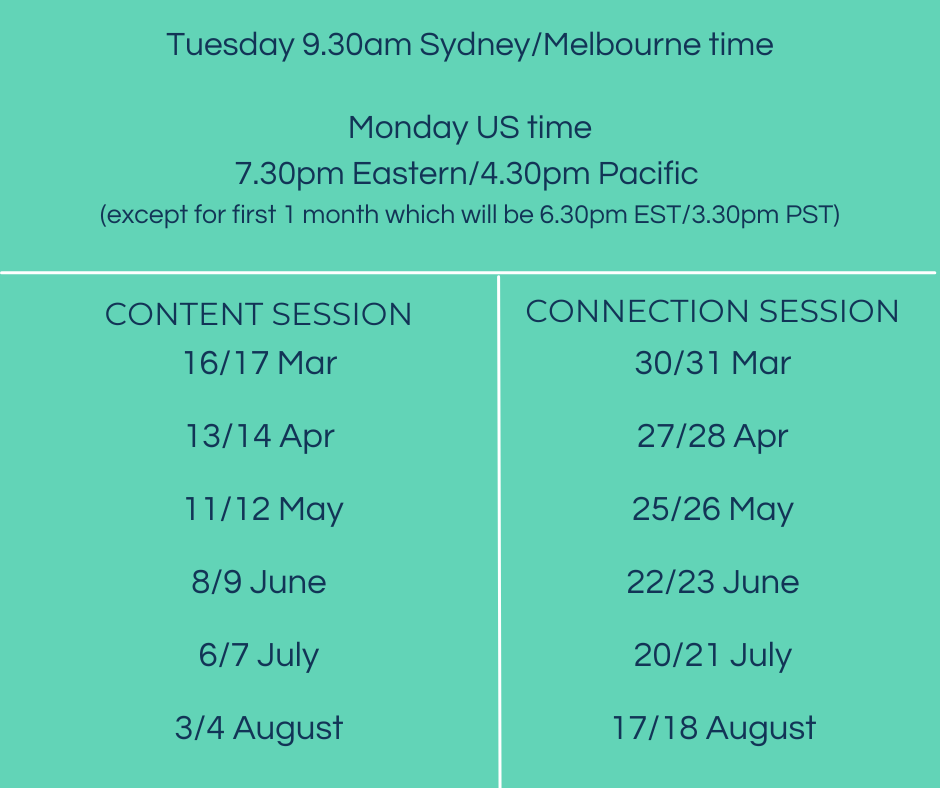 Over 6 months you, me and a group of about 10 other health and/or helping professionals will meet every two weeks to explore, unlearn, connect and integrate through content and conversation.
